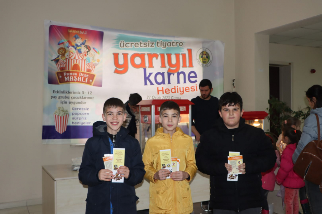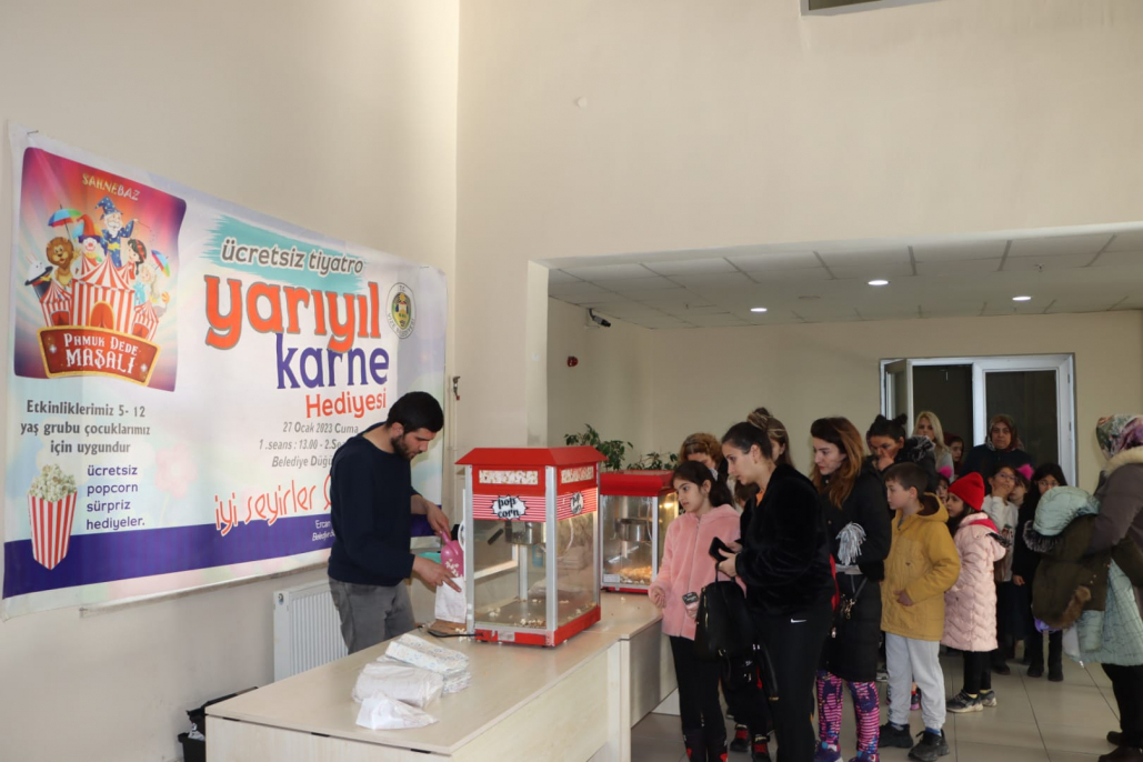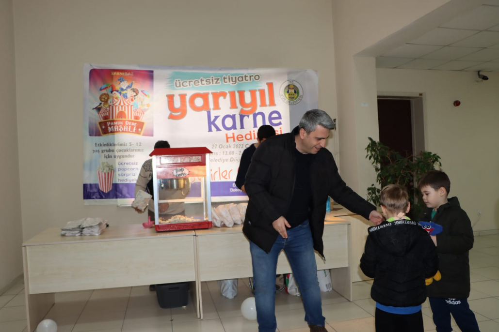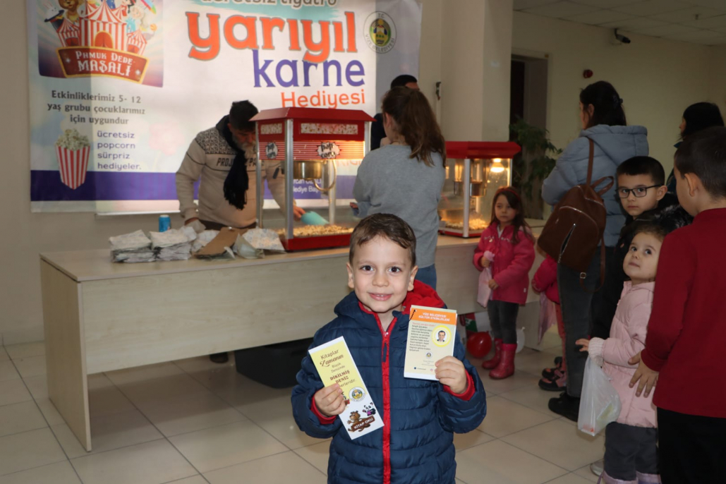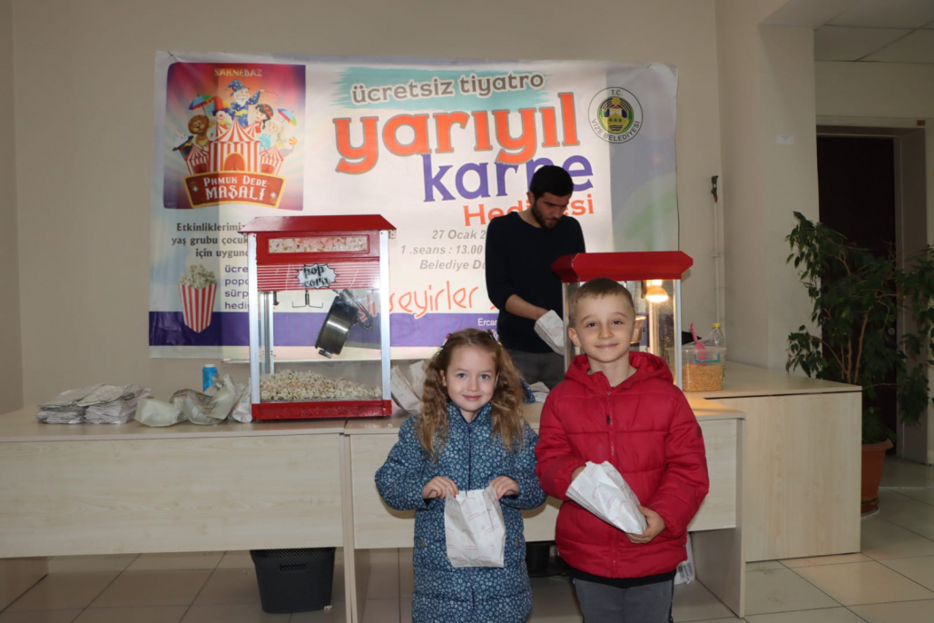 Belediyemiz tarafından yarı yıl tatiline özel çocuklarımıza yönelik düzenlenen Pamuk Dede Masalı adlı tiyatro bugün gerçekleştirildi. Tiyatro girişinde tüm çocuklara patlamış mısır ile oyun kartları ve kitap ayracı hediye edildi. 2 seans halinde oynanan tiyatro oyununa ilgi yoğundu. Belediye Başkanımız Ercan ÖZALP tiyatronun 2. Seansını çocuklarımız ile birlikte izledi. Tiyatronun sonunda Başkan ÖZALP; sömestr tatilinde siz değerli çocuklarımız için tiyatro oyununu sizlerle buluşturmanın mutluluğunu yaşıyorum. Oyuncularımıza böyle güzel ve anlamlı bir oyun sergiledikleri için, siz değerli çocuklarımız ve velilerimize de bizleri yalnız bırakmayarak bugüne eşlik ettiğiniz için teşekkürlerimi sunuyorum. Bu güzel etkinliklerimiz her zaman artarak devam edecektir.İyi tatiller diliyorum.dedi.