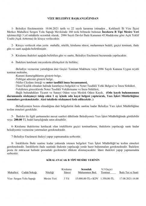 -Belediye veznesine yatırdığına dair Geçici Teminat Makbuzu veya 2886 Sayılı Kanuna Uygun teyitli teminat mektubu,     -Kanuni ikametgâhlarını gösterir belge,           -Tebligat adresini gösterir belge,           -Nüfus Cüzdanı örneği ve noter tasdikli imza beyannamesi,           -Tüzel Kişilik olmaları halinde kanıtlayıcı belgeleri ve Noter Tasdikli Yetki Belgesi ve İmza Sirküleri.           -Vekâleten gireceklerde Noter Tasdikli Vekâletname ve İmza Sirküleri,           -Bağlı bulundukları Ticaret ve Sanayi Odası veya Meslek Odası Kaydı,  (Oda kaydı bulunmaması durumunda sözleşmeyi takip eden 1 ay içinde oda kayıt belgesi yaptırarak, Yazı İşleri Müdürlüğüne sunmaları gerekmektedir. Aksi takdirde sözleşmesi fesh edilecektir. )                   -Belediyemize borcu olmadığına dair belgelerini ihale saatine kadar Belediye Yazı işleri Müdürlüğüne teslim etmeleri gereklidir.     KİRALANACAK B TİPİ MESİRE YERİNİN Kiralama               Sezonluk              %3 Geçici   Mahallesi     Cadde/Sokağı             Niteliği               Süresi           Muhammen Bed.      Teminat              İhale Tar.ve Saati     Vize- Sergen Yolu Sapağı           Mesire Yeri          3 Yıl         15.000,00-TL+ KDV   1.350,00-TL        17.08.2021-14.00    Kırklareli ili Vize Belediyesi'ne ait kurumsal web sitesi. Vize Belediyesi'nden güncel haberler, projelerimiz, hizmetlerimiz ve e-belediye işlemleri