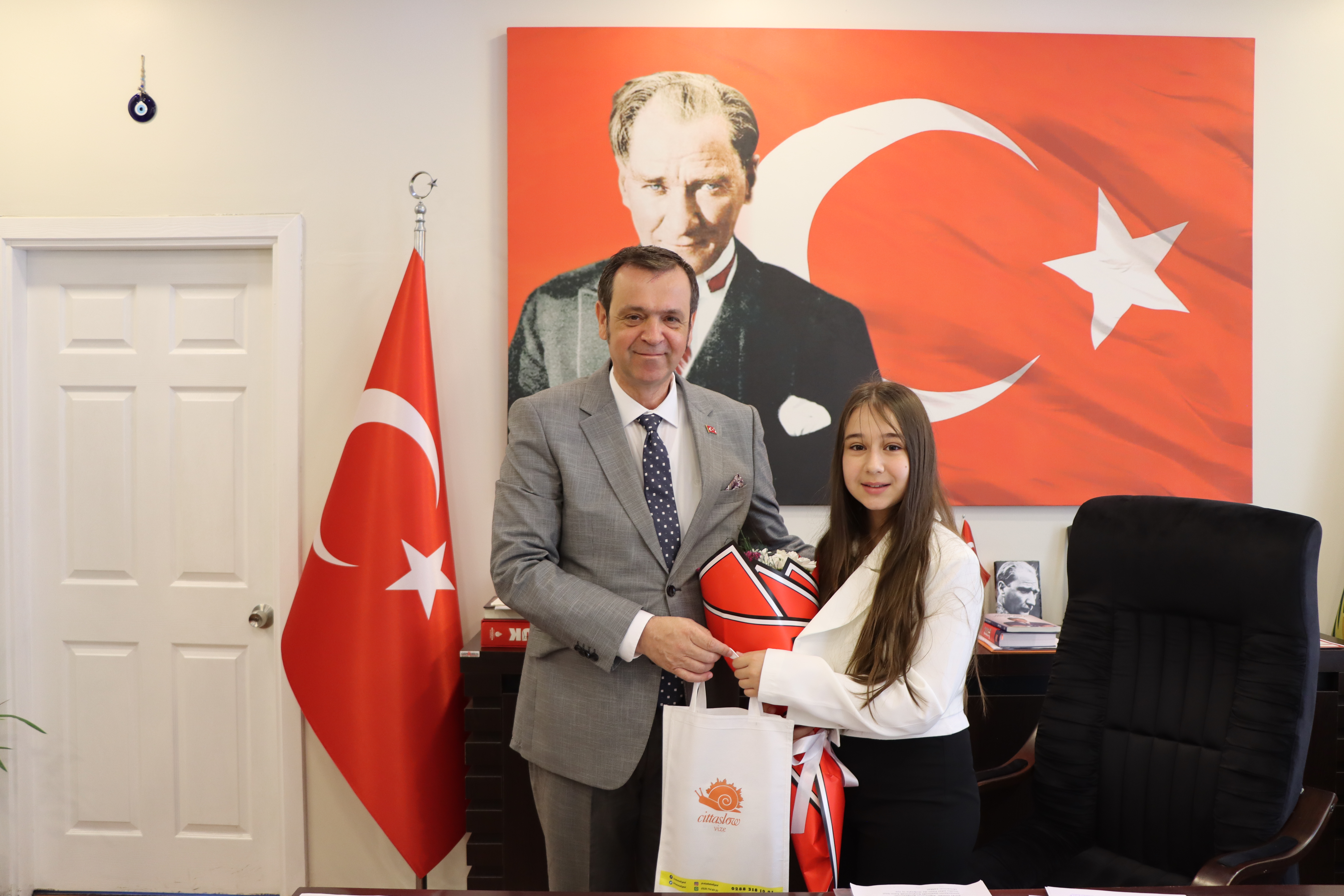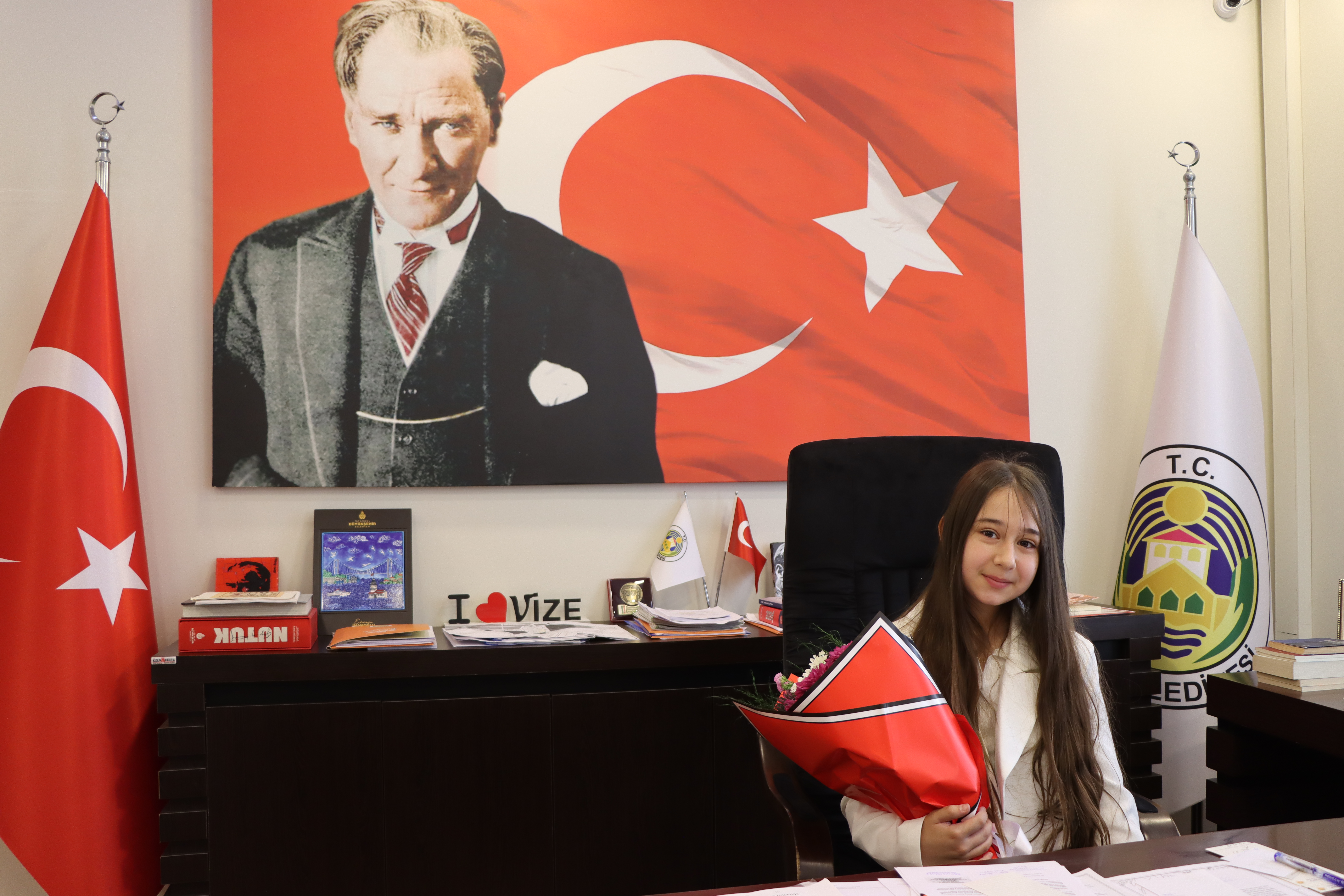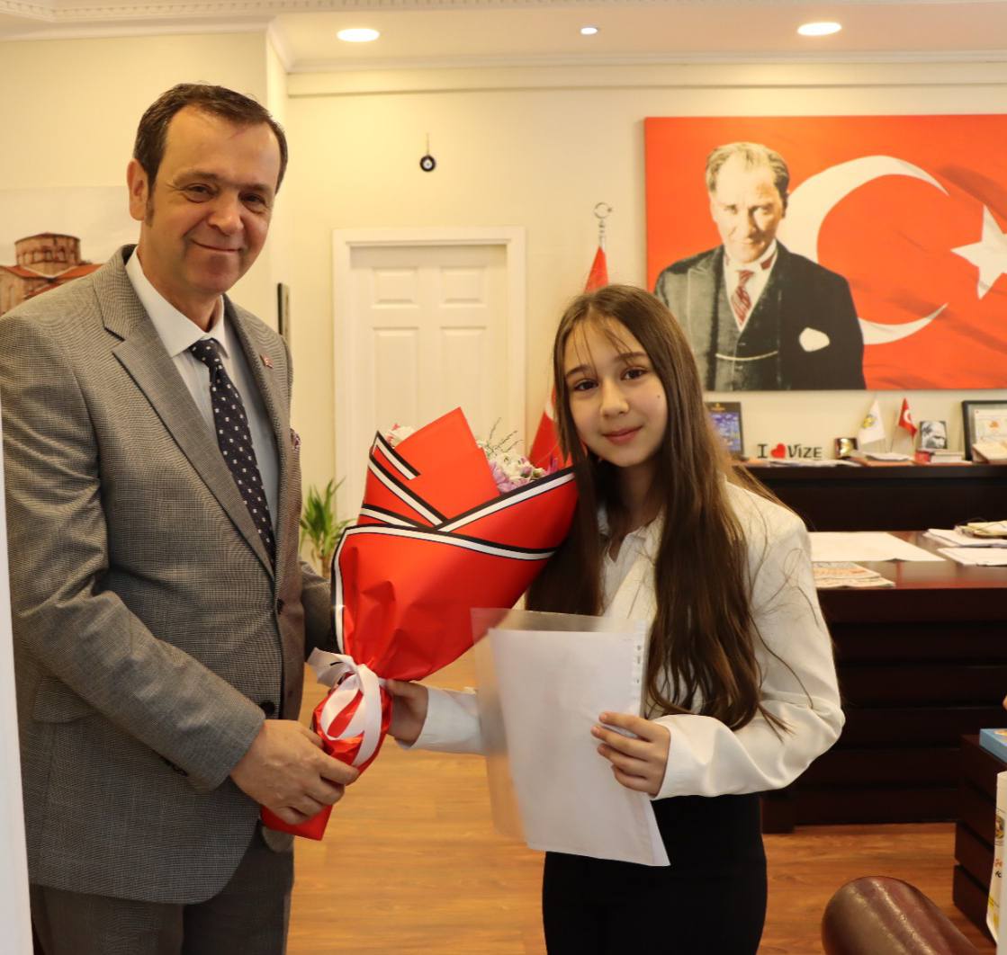23 Nisan Ulusal Egemenlik ve Çocuk Bayramı dolayısıyla makam ziyaretleri kapsamında temsili Belediye Başkanı ilçemiz Atatürk Ortaokulu 5/C Sınıfı öğrencilerinden Buğlem KAYMAZ oldu.Okul Müdürü Ahmet YAZICI ile birlikte gerçekleştirilen ziyarette temsili Belediye Başkanı olarak Belediye Başkanımız Ercan ÖZALP’e taleplerini ileten Buğlem KAYMAZ Vize ve okulları için neler yapılabileceğini belirterek dileklerini iletti.Belediye Başkanımız Ercan ÖZALP, Ulu Önder Mustafa Kemal Atatürk’ün sevgili çocuklarımıza armağan ettiği bayramda çocuklarımızın herzaman daha mutlu bir geleceğe yürümeleri için çalışmalarımızın devam edeceğini söyleyerek temsili başkana günün anlam ve önemine ilişkin hediyesini takdim etti ve ziyareti dolayısıyla teşekkürlerini iletti.